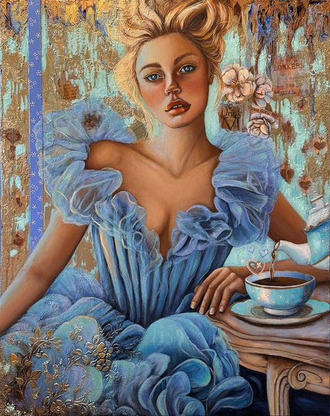 My work blends classical oil techniques with mixed media textures — gilded surfaces, intuitive marks, and layered symbolism. Each piece holds a story waiting to be discovered, inviting you into a quiet moment of connection and imagination.